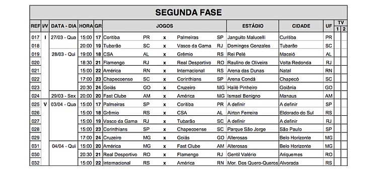 O confronto que abre as oitavas de final, entre Coritiba e Palmeiras, será no Estádio Janguito Malucelli, às 15h. No mesmo dia, Tubarão-SC e Vasco se enfrentam Estádio Domingos Gonzales, às 20h. Flamengo, Real Desportivo-RO, América-RN, Internacional, Chapecoense, Corinthians, Goiás, Cruzeiro, Fast Clube-AM e América-MG também conheceram datas, horários e locais de seus duelos.