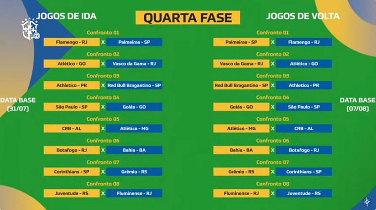 A CBF realizou nesta quinta-feira (18), no auditório da confederação, no Rio de Janeiro, o sorteio dos confrontos das oitavas de final da Copa do Brasil. A primeira partida sorteada foi o embate entre Flamengo e Palmeiras. Representante de Alagoas na competição, o CRB vai encarar o Atlético-MG.