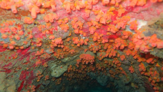 Grande número de pequenas colônias, demonstrando rápido crescimento, no naufrágio do Itapagé (Crédito: Cláudio Sampaio/Ufal)