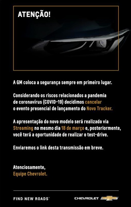 A última montadora a cancelar um lançamento foi a Chevrolet. Inicialmente a marca reduziu de dois para um dia de duração o lançamento, mas após a desistência de quase todos os convidados resolveu cancelar o evento. O lançamento da nova geração da Tracker com motor turbo será online na próxima quarta-feira dia 18.