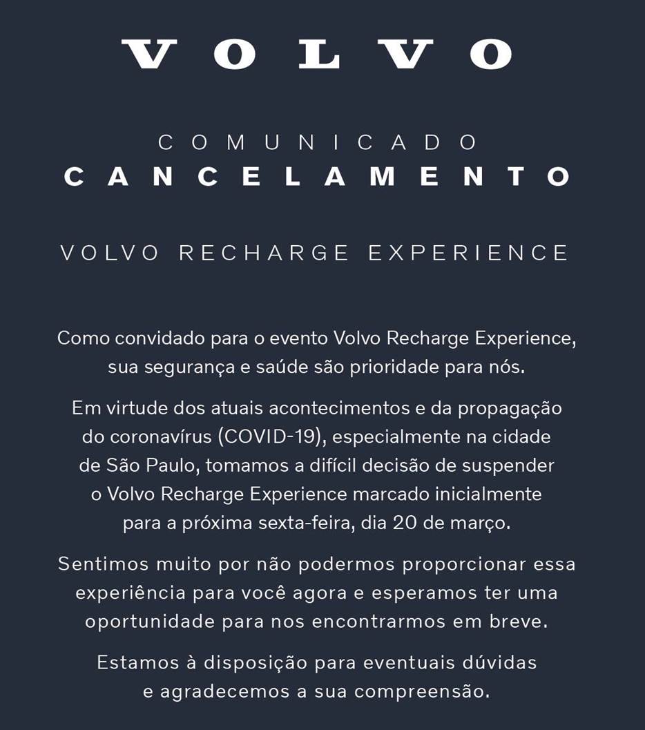 A Volvo cancelou um evento que seria sexta-feira (20) em São Paulo onde executivos suecos explicariam os compromissos da marca com eletrificação e meio ambiente, além de apresentar um novo modelo híbrido da marca à venda no Brasil. A marca enviou um comunicado explicando o cancelamento reforçando a preocupação com a segurança e saúde dos participantes.