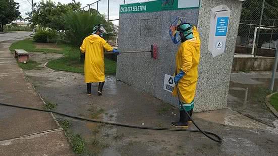 O trabalho de desinfecção de áreas públicas vem acontecendo desde março no entorno das unidades de saúde, principais praças da cidade, terminais e pontos de ônibus, e mercados. A desinfecção é realizada com lavagem e pulverização de água, sabão e solução composta por hipoclorito de sódio, conforme orientação da Agência Nacional de Vigilância Sanitária (Anvisa).
