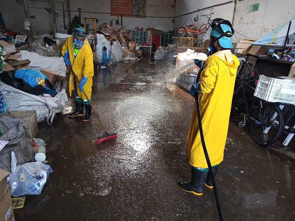 Como medida de higiene e preservação da saúde, os galpões de triagem de recicláveis das quatro cooperativas que prestam serviço à Prefeitura também receberam o serviço de desinfecção.