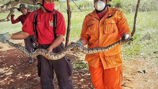 De acordo com informações dos bombeiros, a jiboia estava atacando os animais domésticos da propriedade.
