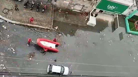 O Corpo de Bombeiros usou um bote inflável para resgatar passageiros de um ônibus que quebrou em meio ao alagamento da Rua Miguel Palmeira, no bairro Pinheiro, próximo à Avenida Fernandes Lima, na manhã desta segunda (28).