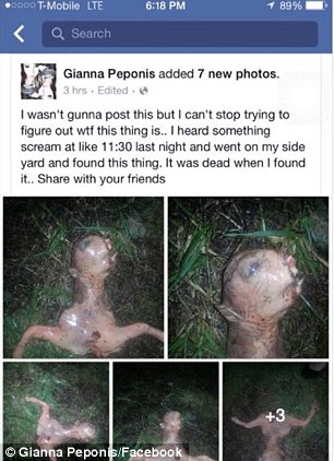 Uma moradora da Califórnia, Estados Unidos, encontrou o corpo de uma criatura viscosa em seu quintal. A adolescente Gianna Peponis relatou que ouviu algo como um grito e foi até a lateral da casa para verificar o que era. Logo que se deparou com a criatura já morta, Gianna publicou a imagem em seu perfil no Facebook com a legenda: “Eu não ia postar isso, mas eu não posso parar de tentar descobrir o que é essa coisa. Ela estava morta quando eu a encontrei”.