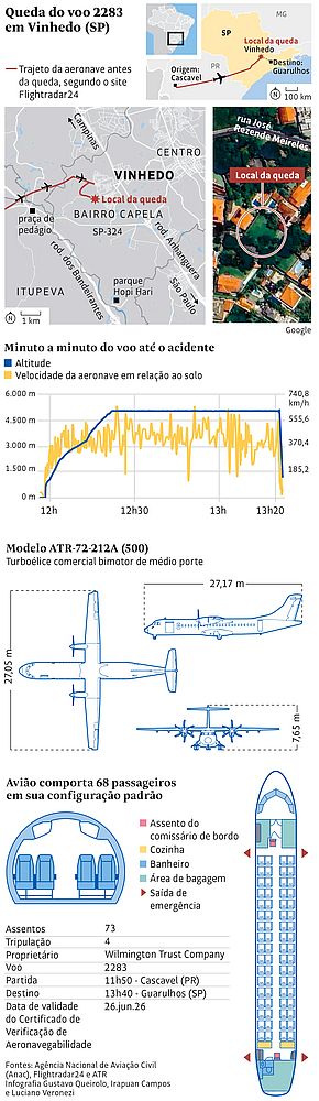O avião estava com 62 pessoas a bordo e caiu em uma área residencial de Vinhedo, no interior de São Paulo, sem deixar sobreviventes. A aeronave saiu de Cascavel (PR), às 11h50, com destino ao aeroporto de Guarulhos (SP). A chegada estava prevista para 13h40; cerca de 20 minutos antes, houve a queda.