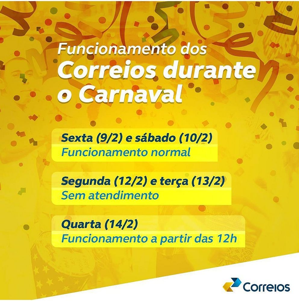O Correios divulgou o horário de funcionamento durante as festividades do Carnaval deste ano. Na sexta (9) e no sábado (10), ele abre normalmente, com a rotina de entregas de cartas e encomendas e atendimento, enquanto no sábado, terá apenas agências abertas. Já na segunda (12) e na terça-feira (13), não haverá atendimento nas agências. O atendimento e as entregas serão retomados na quarta-feira de Cinzas (14), com a abertura das agências a partir das 12h.
