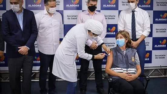Em cerimônia na tarde desta segunda-feira, 5, o Governo de Alagoas iniciou a vacinação contra Covid-19 dos profissionais das forças de segurança do estado. A expectativa é que pelo menos 12 mil agentes estaduais sejam imunizados, mais os efetivos da Polícia Federal, Polícia Rodoviária Federal e das guardas municipais de cada município alagoano.