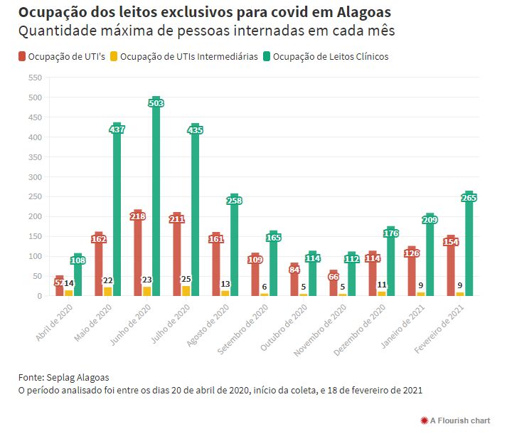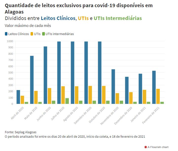 Ainda conforme informações coletadas junto à Secretaria de Estado do Planejamento, Gestão e Patrimônio (Seplag), em maio Alagoas contava com 400 leitos totais. No final daquele mês a capacidade havia sido ampliada para 1.003. Já no fim de setembro, a quantidade de leitos totais chegou a 1.331 leitos.