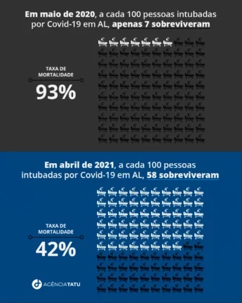 Os dados mostram uma melhora nas chances de sobrevivência para pacientes que precisaram passar por procedimentos de ventilação mecânica no estado. Em abril de 2021, Alagoas chegou ao índice de mortalidade de 42% em pacientes que precisam passar por procedimentos invasivos de oxigenação. Isso significa que a cada 100 pacientes graves que precisam ser intubados, 58 sobrevivem.