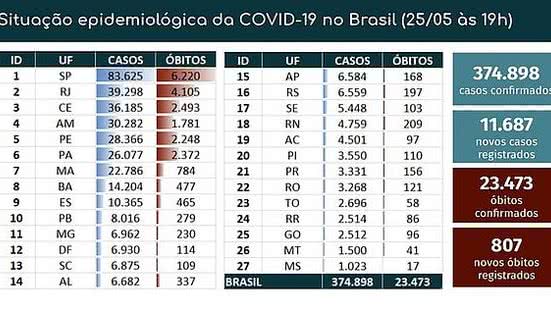 Já em número de casos confirmados, o ranking tem São Paulo (83.62), Rio de Janeiro (39.298), Ceará (36.185), Amazonas (30.282) e Pernambuco (28.366). Entre as unidades da federação com mais pessoas infectadas estão ainda Pará (26.077), Maranhão (22.786), Bahia (14.204), Espírito Santo (10.365) e Paraíba (8.016).