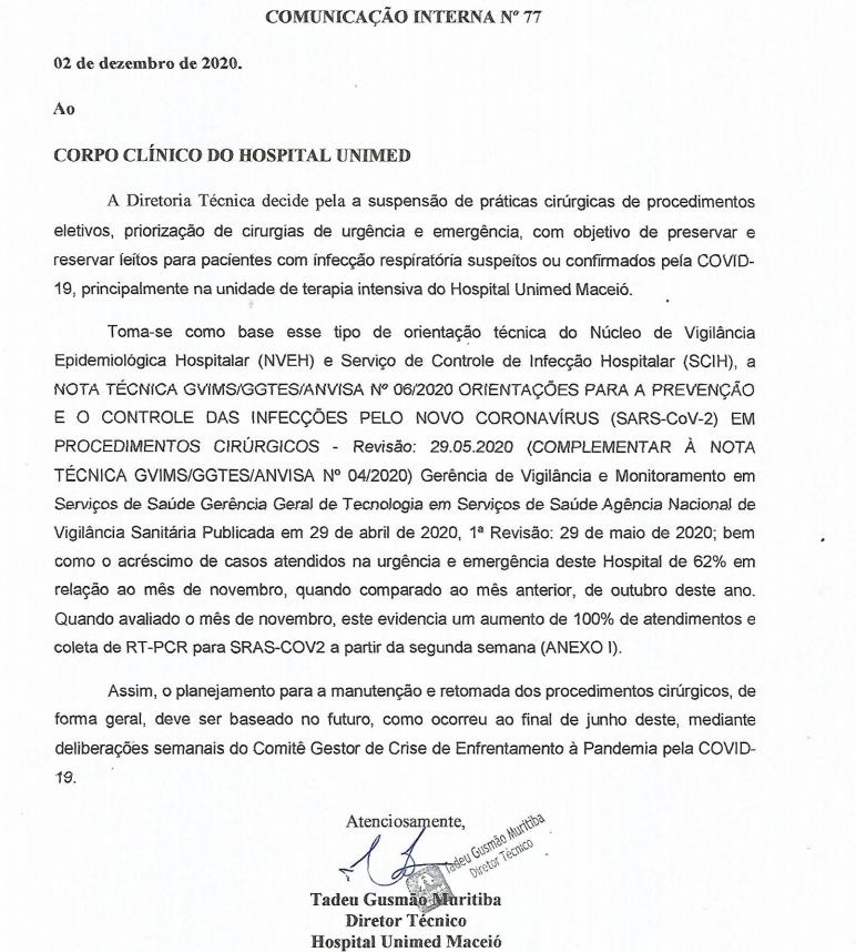A diretoria técnica da Unimed Maceio decidiu suspender todas as cirurgias eletivas e manter apenas os procedimentos cirúrgicos de urgência e emergência. A decisão tem como objetivo preservar e reservar leitos para pacientes de Covid-19, após o crescimento de 62% do número de atendimentos de casos na emergência do hospital, com relação ao mês de novembro.
