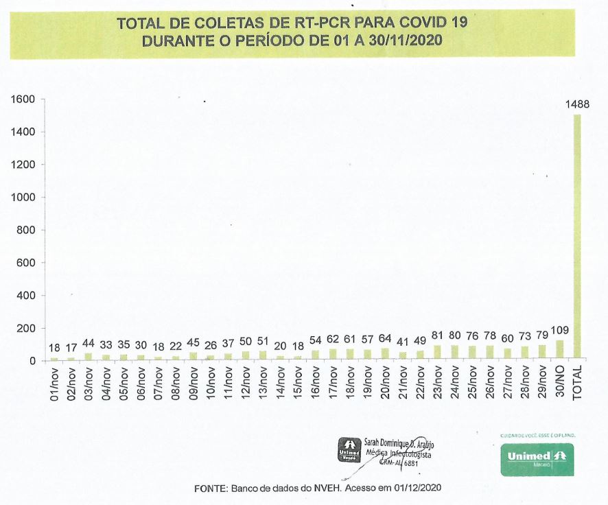 Além do crescimento de atendimentos, o corpo técnico da Unimed Maceió também verificou um aumento de 100% do número de exames de PCR-RT, feito para detectar a doença (veja gráfico abaixo).