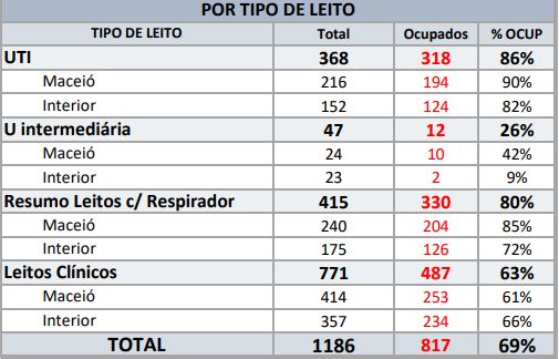 Segundo a Sesau, dos 216 leitos de UTI em Maceió, 194 estão ocupados. Há 22 leitos de UTI livres na capital alagoana. Em relação aos leitos clínicos, a ocupação em Maceió é 63% com 253 das vagas ocupadas.