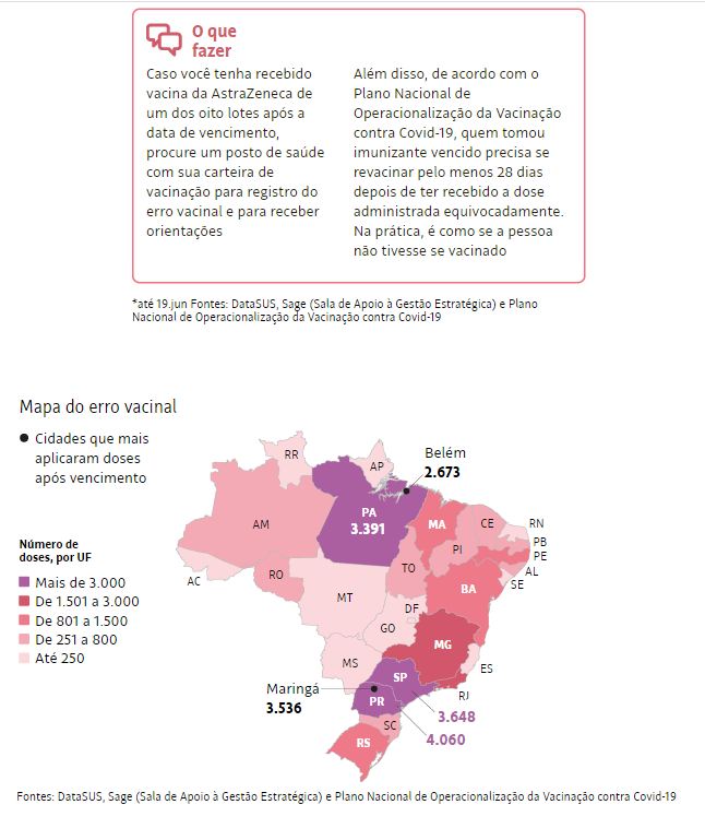 Paraná e Pará —que receberam os imunizantes desse lote em 24 de janeiro, logo depois de o primeiro lote de AstraZeneca da Índia ter chegado ao Brasil— têm a maior quantidade de registros de doses após o vencimento. Em Maringá e Belém, quase todas as doses vencidas foram ministradas especificamente nos dias 22 de abril e 11 de maio.