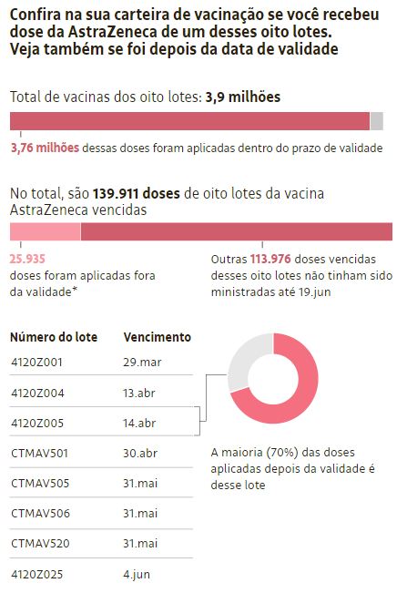 O lote pode ser conferido na carteira individual de vacinação. Quem tiver recebido uma dose de um desses oito lotes de AstraZeneca após a data de validade (veja gráfico) deve procurar uma unidade de saúde para orientações e acompanhamento.