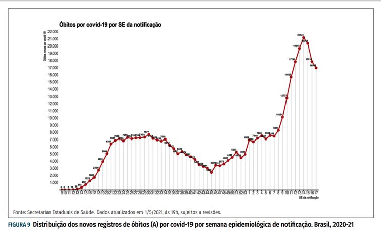 As mortes por covid-19 no Brasil têm apresentado uma leve tendência de queda, segundo dados do Boletim Epidemiológico do Ministério da Saúde. No período de 25 de abril a 1º de maio (Semana Epidemiológica 17), foram registrados 16.945 óbitos, enquanto na semana anterior foram detectadas 17.814 vidas perdidas para a doença.