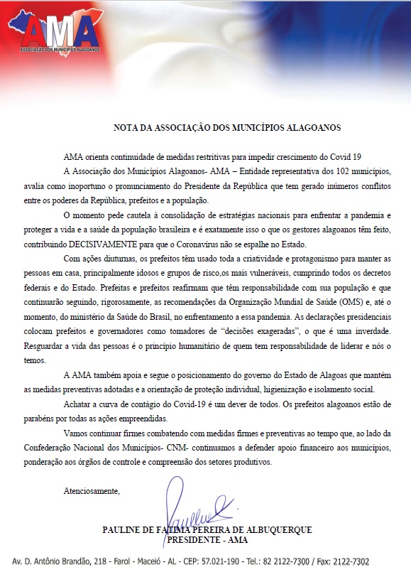 A presidente da AMA, prefeita Pauline Pereira emitiu nota aos gestores onde recomenda seguir as orientações do governo do Estado.