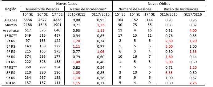 Confira abaixo o número de novos casos e óbitos e a razão de incidências em Alagoas, Maceió, Arapiraca e as Regiões Sanitárias Alagoanas.
