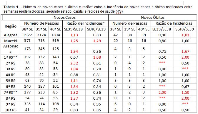 "Em termos regionais, o maior destaque desse período é a situação de Maceió que depois de um “platô” que durou cerca de cinco semanas, registrou um significativo aumento de novos casos nas últimas duas semanas, que fez com que a capital alagoana registra-se 919 novos casos na 40ª SE", detalhou o coordenador do Observatório, o pesquisador Gabriel Bádue.