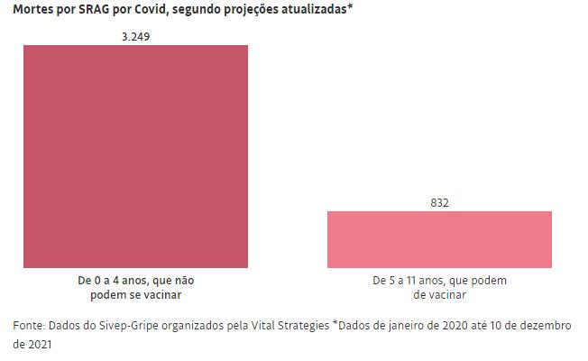 Com isso, o total estimado pode chegar a 4.081 mortes de crianças por Covid. Os números chegariam então a 3.249, de 0 a 4 anos, e 832, de 5 a 11 anos.