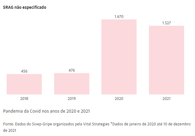 O número excedente foi reclassificado como Covid e também por outros vírus respiratórios, como o da Influenza. Houve explosão de casos de mortes não especificadas por SRAG em 2020 e 2021, o que aponta a preponderância do novo coronavírus.