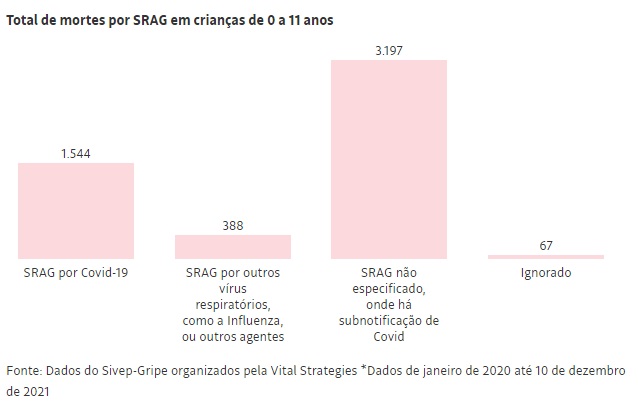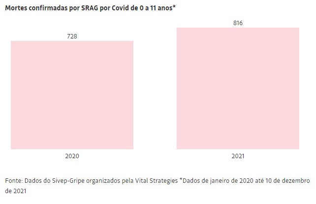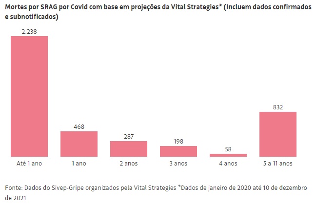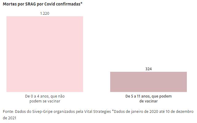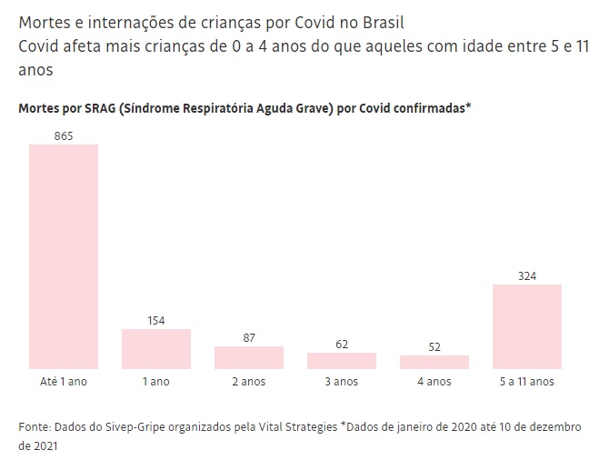 Oficialmente, o Brasil registrou 1.544 mortes de crianças de 0 a 11 anos por Covid-19 desde o início da pandemia. Do total, 324 delas tinham de 5 a 11. Entre 0 e 4, o número de óbitos alcançou 1.220, o que representa quase quatro vezes mais ocorrências que na faixa acima de 5.