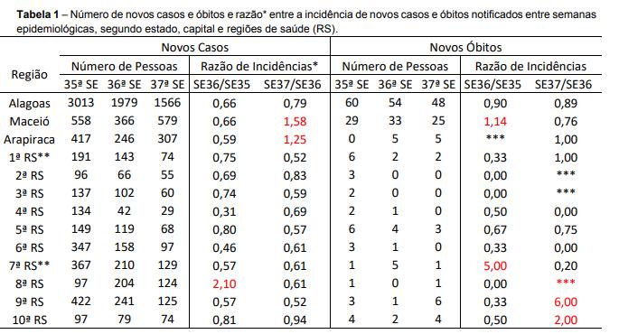 atual (ou mais recente) for maior do que a da semana anterior (destaque em vermelho). Nessa análise Maceió e Arapiraca foram excluídas e analisadas separadamentes.