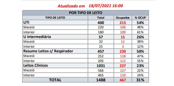O Hospital da Mulher e o Hospital Metropolitano, na capital, e o Hospital de Urgência e Emergência do Agreste, em Arapiraca, estão com atuais níveis de ocupação de UTI em 49%, 59% e 83%, respectivamente.