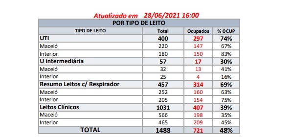 Após os picos de internações por Covid-19 nos últimos meses, a capital alagoana voltou a ter números de ocupação dos leitos de Unidade de Terapia Intensiva (UTI) abaixo da casa dos 70%, aponta o relatório de hoje da Secretaria de Estado da Saúde (Sesau). O monitoramento diário dos leitos exclusivos para Covid-19 mostra que Maceió está com 67% das vagas ocupadas.