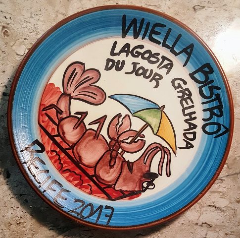 Também de autoria de Claudemir, a “ Lagosta do jou”, prato da Boa Lembrança, que além da bela apresentação é uma deliciosa receita do mar. O crustáceo é grelhado, recebe molho de coco, vatapá de mandioca (textura delicada e sabor maravilhoso) e é decorado com fios de alho poró. O legal ainda, é poder trazer de recordação para minha Maceió o prato de cerâmica com duas lagostas pintadas.