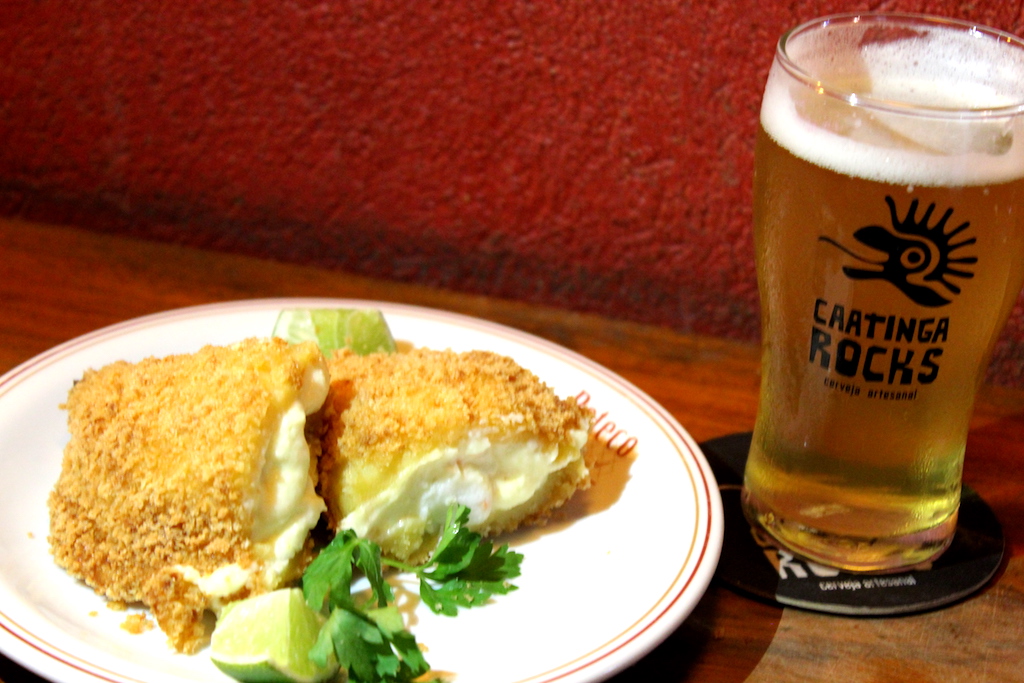 O siri vem do Bar do Bahia em Marechal Deodoro, a carne do crustáceo é cozida com cebola, alho, páprica picante e nos moscada. Já a massa da coxinha é de batata inglesa misturada no caldo de frutos do mar. Petisquei a danada na companhia da Caatinga Rocks, que me levou para conhecer o boteco de nome novo, em homenagem à culinária alagoana pelas mãos do Jair Menezes.