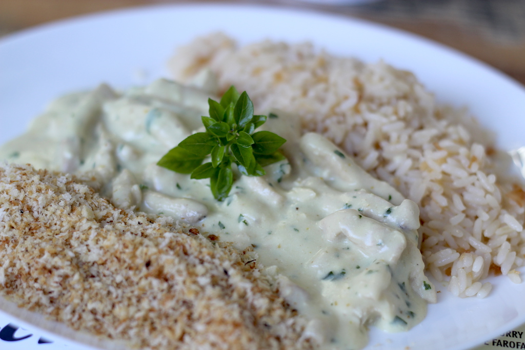 Executivo de Lila: frango ao curry, arroz com coco e farofa