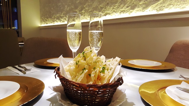 Boas vindas – Folhas finíssimas de trigo, batizada de Focaccine, lembram pizza branca, contudo são bem sequinhas e temperadas com azeite de ervas. A primeira iguaria é cortesia da casa, para acompanhar espumante ou vinho.