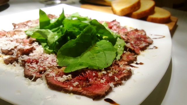 Leve – O filé em fatias finas (tipo carpaccio) é selado e escoltado por rúcula, parmesão, vinagre balsâmico e pão artesanal.