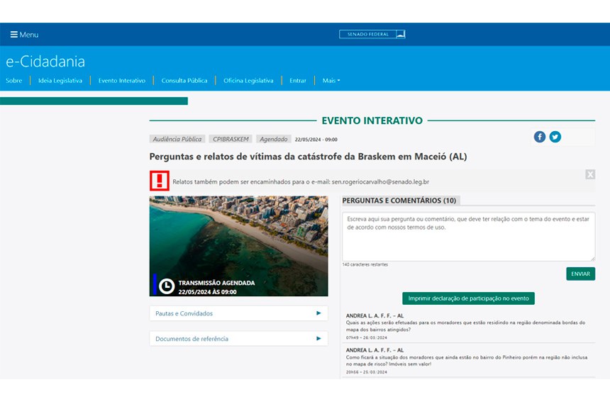 Instalada em dezembro de 2023, mas em atividade há pouco mais de um mês, a comissão parlamentar de inquérito (CPI) instituída para investigar os danos ambientais causados em Maceió pela empresa petroquímica Braskem lançou um site para receber e registrar perguntas e relatos das vítimas da catástrofe.