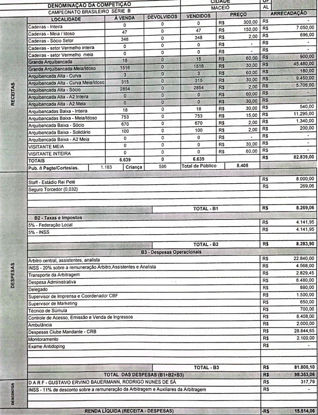Entre as despesas listadas estão o staff do estádio (R$ 8.000,00), os gastos com a arbitragem (R$ 22.840,00), "despesas clube mandante" (R$ 28.844,65) e controle de acesso e emissão de ingressos (R$ 8.408,00). Veja detalhado abaixo: