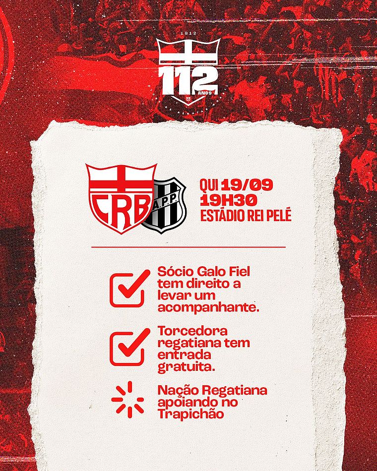 Prestes a completar 112 anos, o Clube de Regatas Brasil anunciou, no início da tarde desta quarta-feira, 18, promoção no acesso dos torcedores ao confronto decisivo com a Ponte Preta. O Galo encara a Ponte nesta quinta-feira, 19, às 19h30, no Rei Pelé, em jogo válido pela 27ª rodada da Série B do Campeonato Brasileiro.
