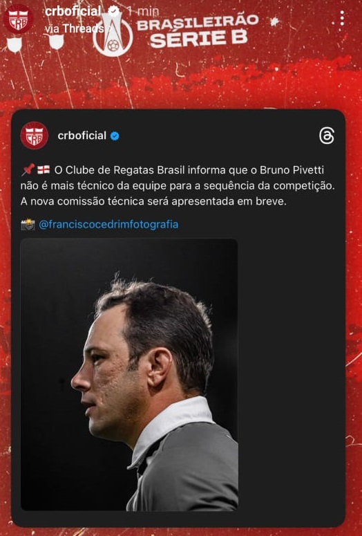 "O Clube de Regatas Brasil informa que o Bruno Pivetti não é mais técnico da equipe para a sequência da competição. A nova comissão técnica será apresentada em breve", mostra a publicação.