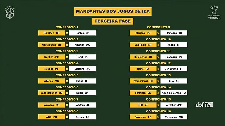 Na Terceira Fase, a Copa do Brasil deixa o jogo único para trás e passa a ser disputada em confrontos de ida e volta. A tabela básica da competição tem os dias 12 e 26 de abril como datas-base para realização das partidas.