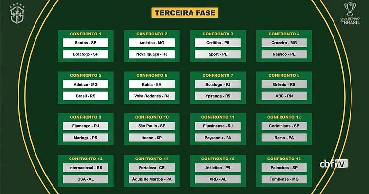 A Confederação Brasileira de Futebol sorteou, na tarde desta quarta-feira, 29, os confrontos da Terceira Fase da Copa do Brasil 2023. O sorteio foi realizado na sede da CBF, no Rio de Janeiro. Esta fase da competição mais democrática do país conta com a entrada dos participantes da Libertadores e os atuais campeões da Copa do Nordeste, Copa Verde e Série B do Campeonato Brasileiro. Os clubes marcados em negrito serão mandantes no jogo de ida.
