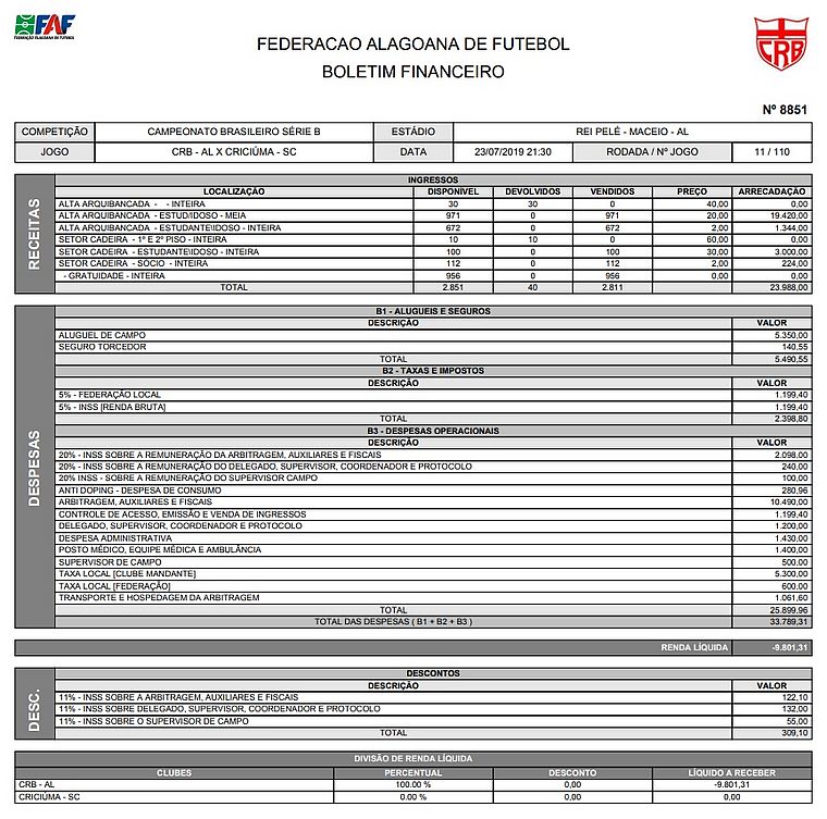 Segundo o documento, publicado no site da Confederação Brasileira de Futebol, 1.855 torcedores pagaram ingresso, enquanto o público total no Trapichão somou 2.811 torcedores. A arrecadação bruta com a bilheteria gerou R$ 23.988,00, mas o valor não foi suficiente para cobrir os gastos e o CRB ficou com um negativo de R$ 9.801,31.