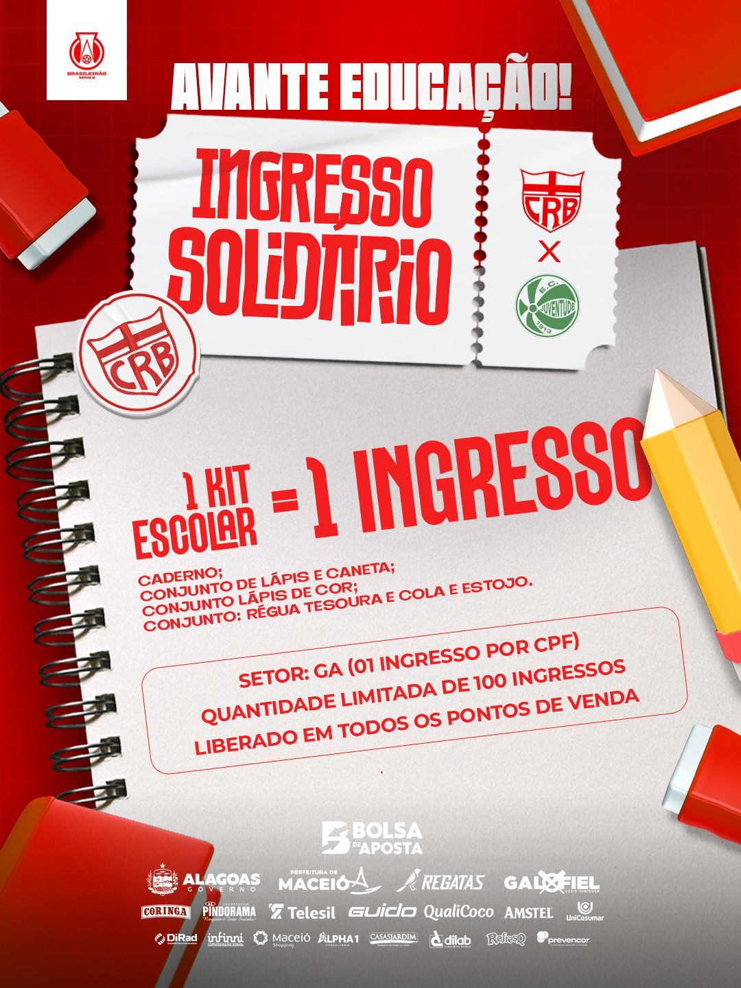 Também há a opção de ingresso solidário, limitado a 100 unidades. O torcedor pode trocar um kit escolar (veja o card abaixo) por um ingresso da Grande Arquibancada.