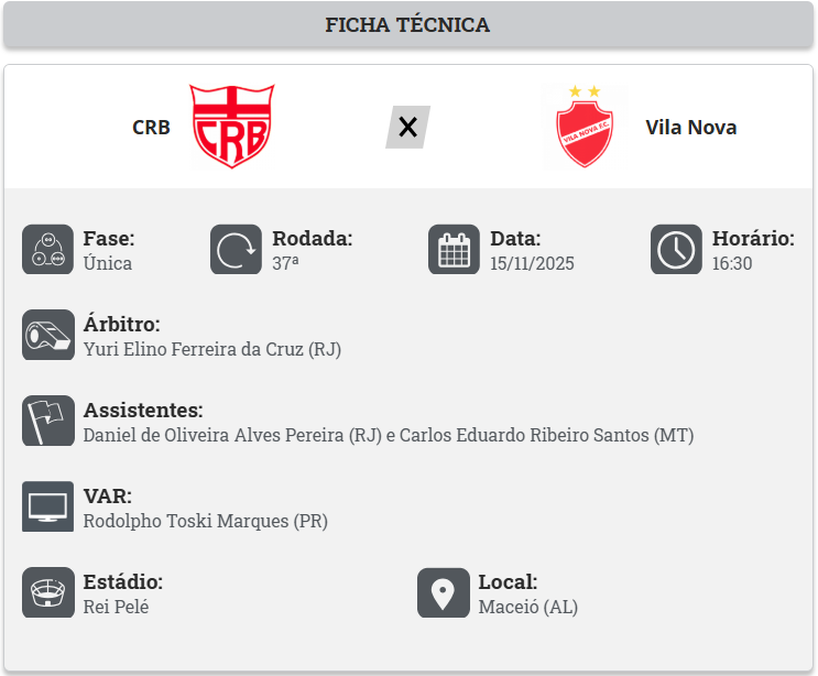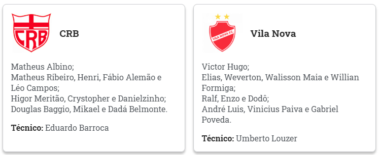 CRBe Vila Nova se enfrentam neste sábado (15), às 16h30 de Brasília, no Estádio Rei Pelé, em duelo válido pela trigésima sexta rodada da Série B do Campeonato Brasileiro. A partida terá transmissão pelo Disney+.