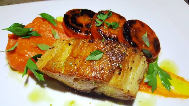 Abóbora – O peixe grelhado é sempre bom, e quando tem arabaiana dos mares alagoanos, tudo é mais intenso ao paladar. O peixe estava suculento e, para acompanhar, rodelas de cenoura grelhadas e puré de abóbora apimentado.