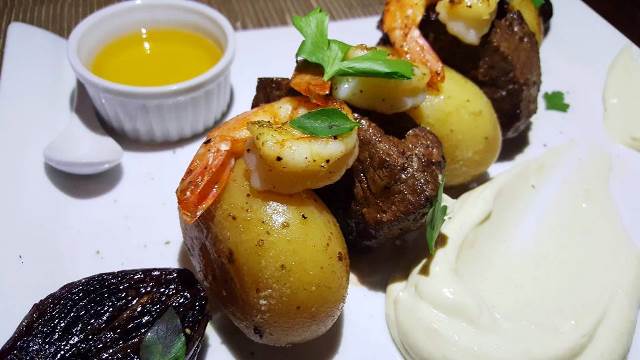Mar + terra – A mistura de camarão e carne não é nova, mas os chefs inventaram uma versão bem saborosa. São cubos de filé, camarão, batatas e cebolas roxas, intercaladas, na companhia de dois molhos, o lactonese (maionese de leite) e o de manteiga de garrafa. Tudo em perfeita harmonia, eu adorei mergulhar o camarão grelhado e a carne na manteiga de garrafa. Já a batata cozida, é ótima para acompanhar a carne. E a cebola roxa, cozida na água de sal e folha de louro, é finalizada na grelha com manteiga de garrafa, é de comer sozinha, da simplicidade ao luxo do modo de preparar o vegetal.