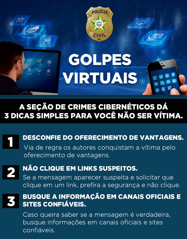 O delegado José Carlos, responsável pela Seção de Crimes Cibernéticos, da Polícia Civil de Alagoas (PCAL), divulgou um material de orientação com informações básicas para que as pessoas não sejam vítimas de golpes virtuais.