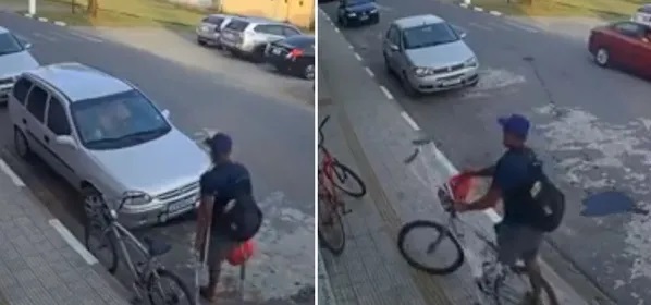 Um câmera de monitoramento instalada em frente ao mercado flagrou toda a ação do criminoso - o furto levou menos de um minuto. Apoiado em muletas e com uma mochila nas costas, o suspeito olha para os lados e fica rondando a bicicleta. Ao perceber que ninguém estava olhando, ele sobe nela e foge.