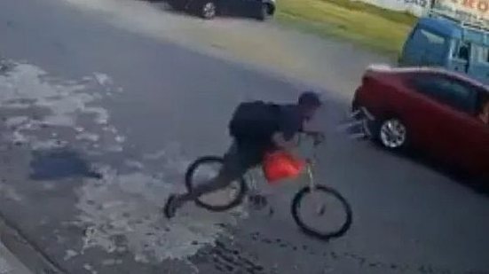 Um câmera de monitoramento instalada em frente ao mercado flagrou toda a ação do criminoso - o furto levou menos de um minuto. Apoiado em muletas e com uma mochila nas costas, o suspeito olha para os lados e fica rondando a bicicleta. Ao perceber que ninguém estava olhando, ele sobe nela e foge.
